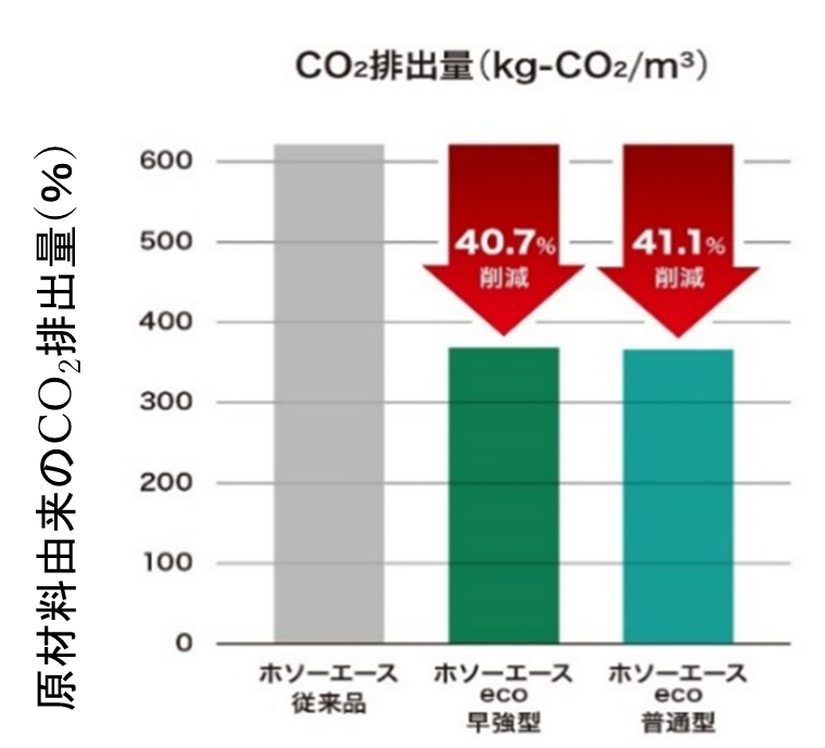 「ホソーエースeco」は使用するセメントの一部を産業副産物に置換することで、原材料製造由来のCO2排出量を当社従来品と比較して約40%削減しており、従来の「ホソーエース」が619kg/m3であるのに対し、「ホソーエースeco」では365kg/m3に留めています。