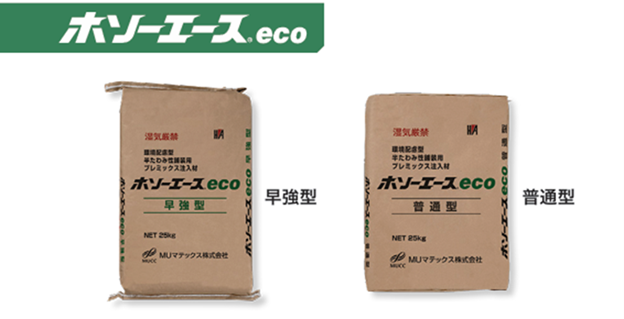 セメントを産業副産物に置き換えると一般的に強度は低下しますが、「ホソーエースeco」はMUマテックス社の技術により、高い流動性と優れた強度発現性を実現し、従来の「ホソーエース」と同等の性能を維持しています。